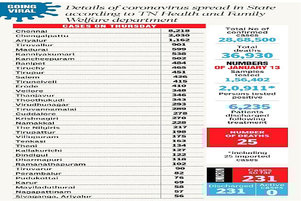 As per the data, 24,174 patients are under home quarantine as of Thursday morning. Also, residents can contact 044-25384520 and 044-46122300 for COVID-19 related assistance.
