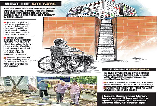 It is a struggle for 35-year-old Malarvizhi K from Broadway whenever the school where her son studies invites parents for any meeting or function. “The school doesn’t have any feature that supports the differently abled people. Though frequented by thousands of people daily, it doesn’t have a ramp, not to speak of differently abled friendly toilets or other facilities,” rued the wheel-chair bound mother.