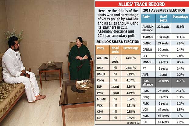 The NDA finished the tally with just two seats, though senior leaders of constituent parties were fielded at many places. In the coming Assembly election too, AIADMK is likely to go it alone. So, a glance at the percentage of votes polled by the popular parties, besides the two Dravidian majors, will clearly show that this election may also go in favour of J Jayalalithaa, according to some political observers.