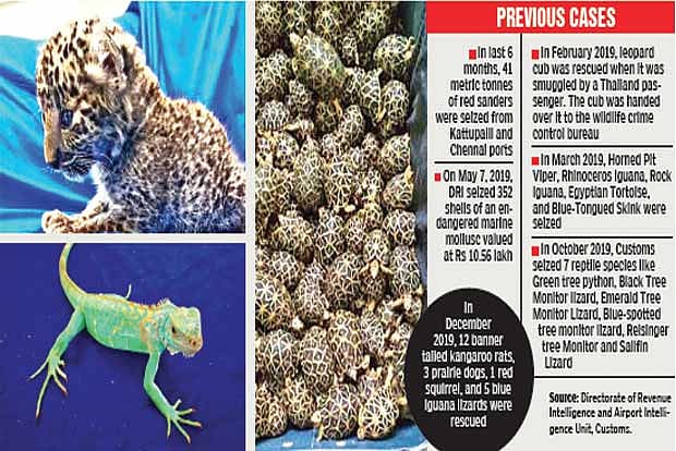 In the case of illegal exports, red sanders, shark fins, mongoose, pangolin, star tortoise, sea cucumber is smuggled out from south India via Chennai, said Traffic India sources dealing with illegal wildlife trade investigations in south India.