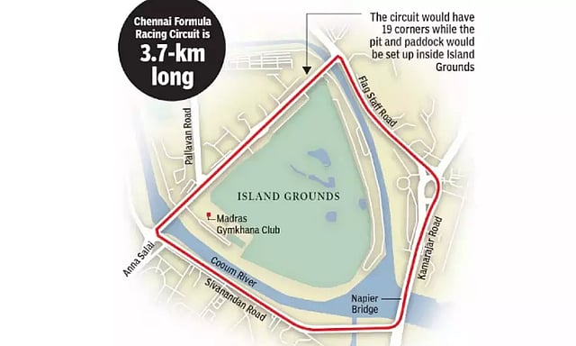 The race will commence from Island Ground and covers Flag Staff Road, Anna Salai, Sivananda Salai, and Napier Bridge, and return to the ground. The circuit will have 19 corners while the pit and paddock structures would come up inside Island Ground.
