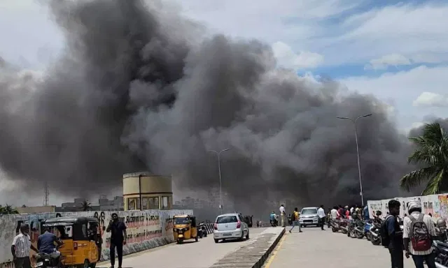 CHENNAI: A massive fire broke out at a fair selling old goods opposite the Kilambakkam bus terminus, resulting in significant damage and chaos. The fire erupted around 11 am and quickly engulfed the premises. The traffic on the Chennai-Tiruchy National Highway was severely affected due to the thick plumes of smoke billowing from it.
