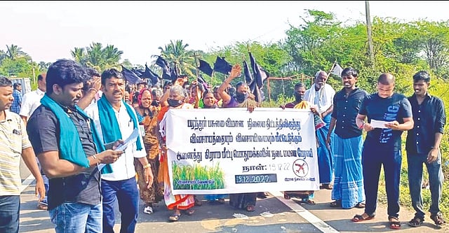 On Monday, the villagers gathered in Ekanapuram and marched towards the Kancheepuram collectorate with black flags raising slogans to drop the plan and change the location of the airport.