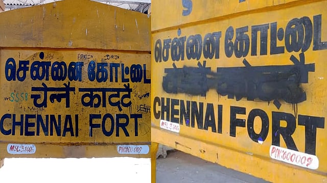 CHENNAI: Unidentified men used ink to blacken Hindi words on a name board at Fort Station in Chennai. The board of suburban railway Station will have mentions in English, Tamil, and Hindi.