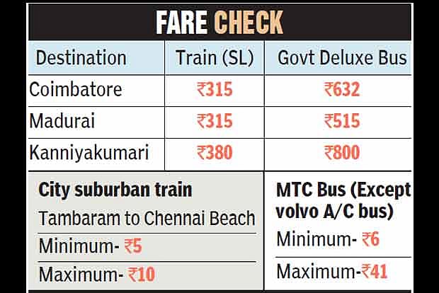 “I booked train tickets from Madurai to Chennai for Rs 315 in sleeper class, whereas the fare for government Ultra deluxe (non AC) showed Rs 515,” said Gulam Mohammed, a techie. He added that while the fare for A/C bus was Rs 653, it cost Rs 815 for 3-tier A/C. When compared to train ticket prices, bus fares to other main cities like Coimbatore and Kanyakumari also remain high.