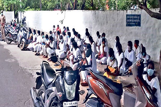 Even as the 43 nurses were waiting at the pavement near the Minister’s residence around 3.15 pm, a huge branch of a tree from the other side of a compound wall broke and fell in the sudden downpour. Abiramapuram inspector went to the spot and collected their petition, after which the nurses dispersed. They are among the 84 nurses who were recruited in April for COVID duty on the promise of permanent job. However, 52 nurses who were in Chennai were recently told that the jobs won’t be made permanent. They also alleged that salary was not being paid for three months.