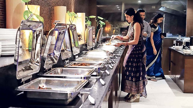 Last comes the icing: the desserts. German Black Forest, chocolate brownies, panna cotta, berry mousse, carrot halwa, and elaneer payasam round off the night, and most tables linger longer than planned.