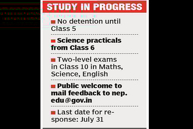 The draft proposal includes a common national curriculum for Science, Mathematics and English in schools across the country. It envisages introducing practical lessons in Science subjects from Class 6 onwards and two levels of examination for Class 10 in Mathematics, Science and English. The draft proposes the no detention policy upto Class 5 only and the system of detention will be restored at the upper primary stage.