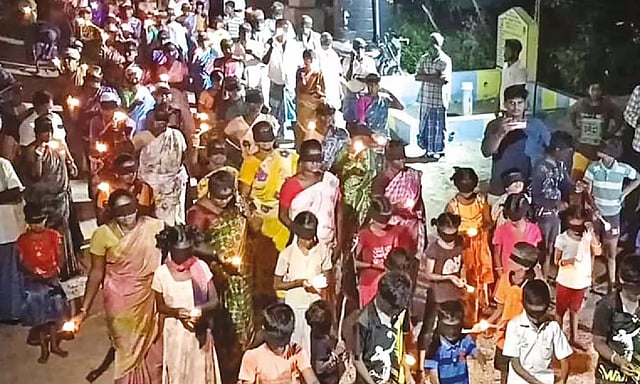 Following the 400th day of the protest, the villagers of Egnanapuram, Parandur and its surrounding areas gathered on the ground and protested by covering their eyes with a black cloth. The villagers also lit candles and by holding black flags and raised slogans. They said they won’t give their land for the construction of the proposed airport and added that they don’t need an airport.