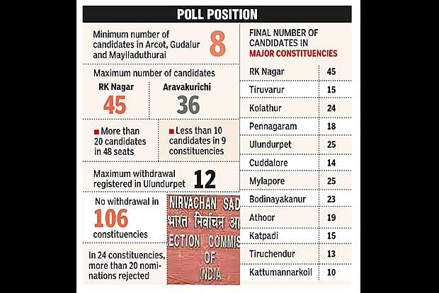 While about 2,586 candidates contested in 2006, as many as 2,748 were in the fray in 2011. It may be noted that a total of 2,834 candidates contested in 1991 general election. Interestingly, Chief Minister J Jayalalithaa’s RK Nagar has emerged as the constituency with most number of contestants for the May 16 poll, as none of the 45 candidates chose to withdraw.
