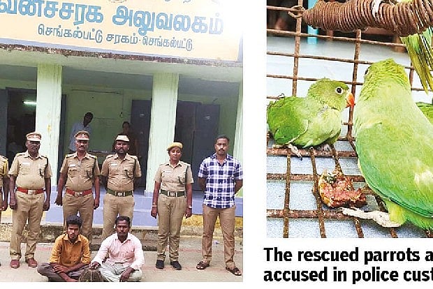 Tamilarasan (27) of Maduranthagam and Sadiq Basha (28) of Guduvanchery went to Chengalpattu with four parrots. When they handed over the parrots, the forest officers surrounded both of them and arrested them. During the inquiry, they said they purchased the parrots for a low price at Pallavaram weekly market and trained the parrots in their house for a few weeks and then decided to sell them for astrology purposes. Later, both of them were arrested and the parrots were set free in the forest area.