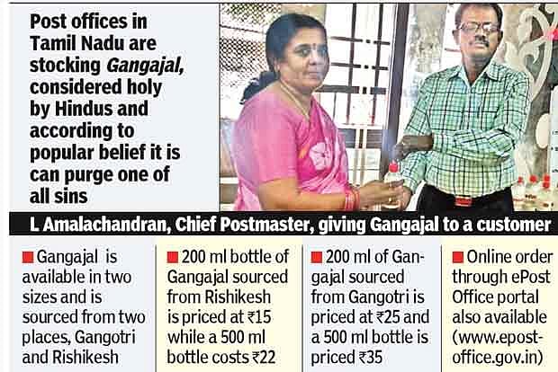 Nearly similar was the response to the Gangajal scheme in districts like Tiruchy and Thanjavur, where the sale was carried out through the Post Shoppe in Tiruchy. As part of an expansion programme to make the water available for the public in the central region of Tamil Nadu, the Probationary IpoS (India Post) Officer V B Ganesh Kumar launched the scheme at HPO on Monday in the presence of Senior Superintendent of Post Offices, Tiruchy Division A K Firoze Mohideen.