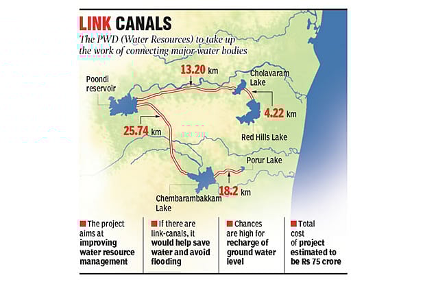 According to the new plan, a link canal would be created from Poondi Reservoir to Chembarambakkam, while Poondi Reservoir would have another link canal to Cholavaram lake, which in turn would be linked to Red Hills. Likewise, there would be a link canal between Chembarambakkam and Porur lake.