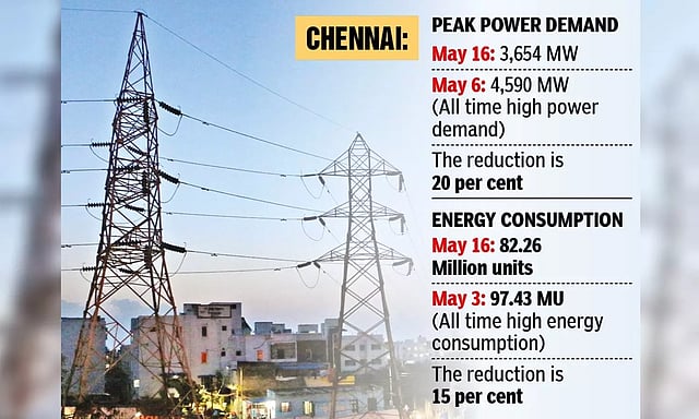 CHENNAI: The intermittent but widespread rains that Chennai received in recent days have brought down the city's peak power demand by 20 per cent to 3,654 MW on Thursday.