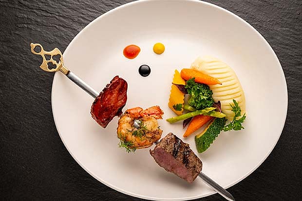 Soon after, a plate with a side of grilled vegetables and mashed potato — so smooth that it melted in the mouth — were placed before us. While Cabernet Shiraz was being poured through a wine aerator into a balloon glass (to help the flavours open up), the chefs presented us with skewers of different meats, in the order of chicken leg followed by Australian lamb, smoked duck, fillet mignon and tiger prawns. Never before had we tasted duck with a hint of smoked bacon to it; the fillet mignon was medium-rare with just the right amount of pink and a red centre. I would call it the hero of the meal.