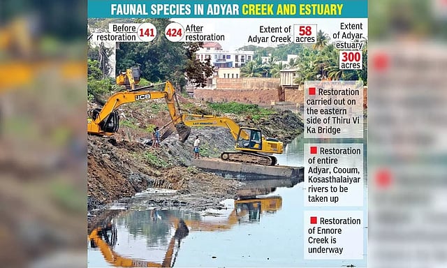 According to a document from the Municipal Administration and Water Supply department, the eco-restoration of 58 acres of Adyar Creek, and 300 acres of the Adyar Estuary was taken up under the Chennai Rivers Restoration Trust (CRRT).