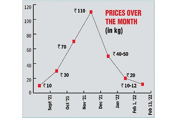 Till September, tomatoes were sold at Rs 10 per kg. After the seasonal rainfall starting in October in Tamil Nadu and the neighbouring states of Andhra Pradesh and Karnataka, the rates climbed to Rs 30 per kg. With the Koyambedu wholesale market receiving less supply, the prices further surged by 30 per cent to Rs 70-80 per kg. And in December, the price skyrocketed to Rs 110 per kg. “As the rainfall reduced, there was a marginal increase in the supply, and the prices came down to Rs 40-50 per kg in January and it gradually came down to Rs 20 per kg. Now, as the crop cultivation has improved, over 500 tonnes of vegetable arrived in the market and the price of tomato fell to Rs 10-12 per kg,” said Prabhakaran, member of Koyambedu Wholesale Tomato Traders’ Association.
