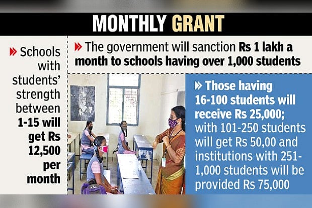 Schools having students’ strength between 1-15 will get Rs 12,500 per month, and the institutions with strength between 16-100 would get Rs 25,000. Those having 101-250 students would get financial assistance of Rs 50,00 and institutions with 251-1,000 students will be provided Rs 75,000.