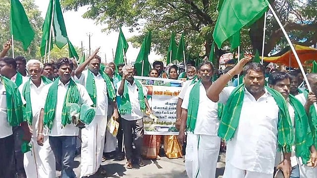 CHENGALPATTU: The Chengalpattu District Farmers Association in Chengalpattu on Monday staged a protest against the State government’s direct rice procurement centres (DPCs) operating in Chengalpattu and Kanchipuram districts. During the protests the farmers condemned the district administration’s failure to implement the Government Order and to point out the inefficient management of the Tamil Nadu Consumer Goods Trade Corporation. More than 100 farmers who had come from the Rattinanginaru area in the district protested in front of the Government Hospital and raised slogans against the politicians who appointed thugs to purchase rice from farmers and took bribes of Rs 50 to 80 per 40 kg bag in the name of expenses and and also assaulted farmers who refused to pay the bribe amount.