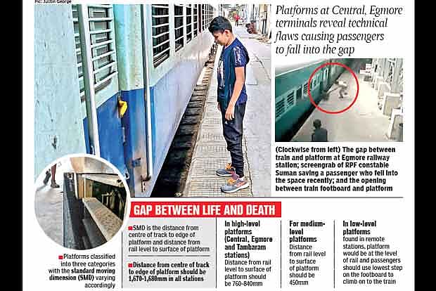 A quick inspection of the platforms at Central and Egmore terminals, which recorded miraculous saves of lives more frequently than other stations, with one as recently as on Monday and Tuesday, revealed that there was wide space between trains and platforms that could easily trap passengers. The fears were vindicated by a few officials who admitted that there was some mismatch between the standard moving dimension (SMD) prescribed in the railway rule book and the actual distance between train and platform at the aforesaid stations.