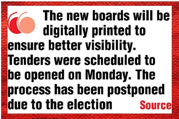 According to bid documents floated by the Corporation, name boards of interior streets and roads across the city will be replaced with new boards. “The new boards will be digitally printed to ensure better visibility. Tenders were scheduled to be opened on Monday. However, the process has been postponed due to the election. Bids will be finalised after the election,” a source said.