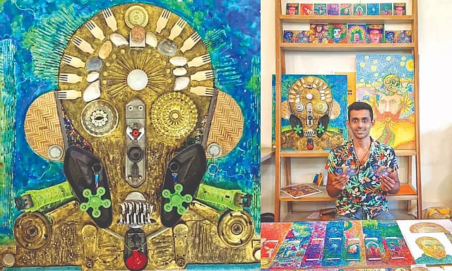 “As a begetter of art, I wanted to display a new piece for an exhibition that I was a part of, but with scraps. I have used nails, bulbs, fidget spinners, dismantled headphones, torch cases, wooden forks, shells, and a wooden board as a base for an abstract face like structure, to produce the upcycled piece,” Arjun states.