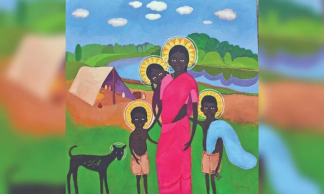 The contemporary piece illustrates a homeless family living clad in rags, setting up a makeshift hut on the river bank. The mother has draped herself in a pink saree, with her nose ring being the only ornament on her face.