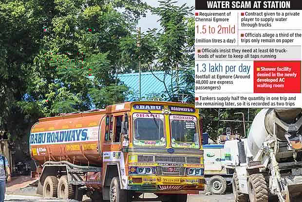 Railway officials may have chanced upon a massive water scam at Chennai Egmore Terminal. At least a third of the trucks engaged to source water for the second most important terminal of the zone remains only on paper, leaving the terminal high and dry.