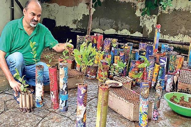 To reduce the landfills, city-based eco-warrior Hafiz Khan is collecting empty cracker cans from the roadsides and recycling them into holders for plant samplings. “Last year, we collected around 20,000 cans from the city. This year, we approached a lot of apartments and all were willing to collect and give us outer shell/case of flower pots, vedis and rockets. We hope to collect 1 lakh empty cans from in and around the city in the coming days. Chennai Corporation has agreed to give us one unit of firecracker trash that is collected from Valsaravakkam,” says Hafiz Khan, a forest creator. He is doing this through his NGO Communitree.