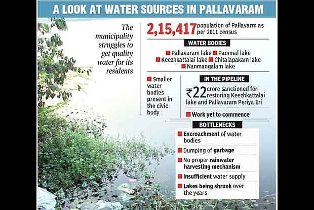 V. Santhanam, president, Federation of Civic and Welfare Associations of Pallavaram Municipality, said that many of the lakes have shrunk severely over the years. “The Nemilichery lake in Chromepet has completely disappeared and only around 3 acres are left. Hasthinapuram lake has shrunk drastically from his original size of almost 10 acres. There is heavy encroachment in Pallavaram municipality, which is growing haphazardly,” he pointed out. The social activist added that the water supply is inadequate for a locality that has rapidly developed over the last few years.