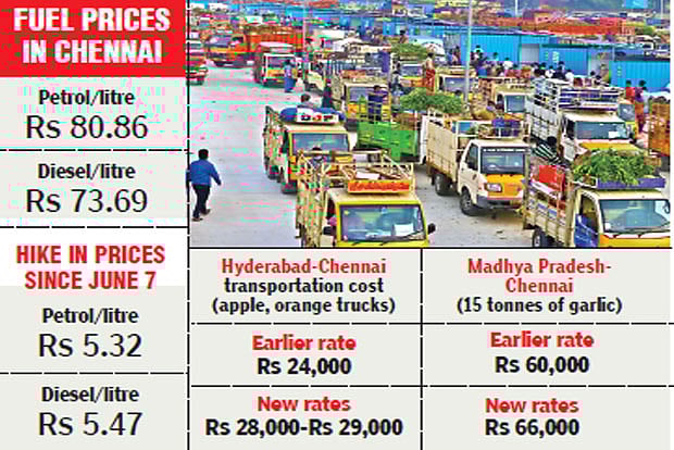 “We have increased the freight charges for goods including vegetables and fruits by up to 20 per cent. We have no other option as the cost of diesel has now gone up by over Rs 5 a litre,” said S Yuvaraj, spokesperson, All India Motor Transport Congress.