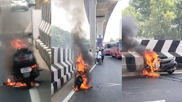 Devadas immediately stopped his vehicle in a hurry, dropped his wife and child, and got down. Within seconds, the two-wheeler caught fire.