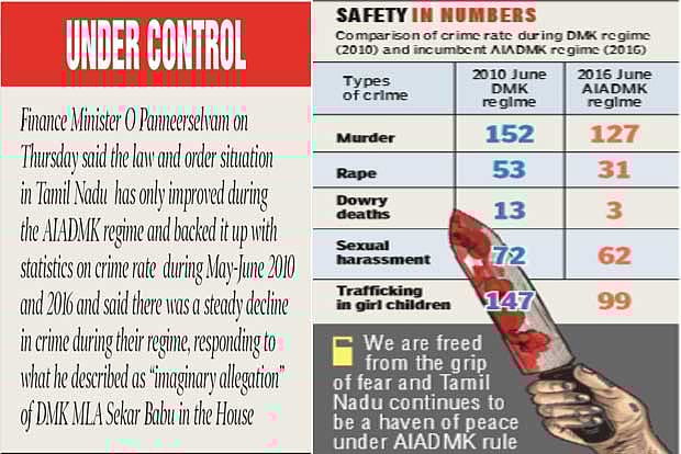 DMK MLA J Anbazhagan and others rushed to the well of the House and picked up a direct argument with the Chair. Leader of the Opposition M K Stalin and Duraimurugan too argued with the Chair and demanded that the Minister’s remarks should also be expunged. But the Speaker did not concede their demands and condemned the way the DMK members were conducting themselves in the House. Earlier, Panneerselvam, intervening P K Sekar Babu (DMK) said the State remained a haven of peace and that crime rates have come down drastically during the AIADMK regime as the police were given a free hand to deal with trouble makers. He also said that police have effectively solved crimes such as techie Swathi murder case, RTI activist Parasmal Jain’s killing and advocate’s Murugan murder.
