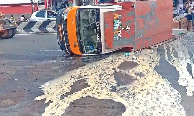When nearing East Tambaram the driver lost control of the vehicle and it turned turtle on the road.