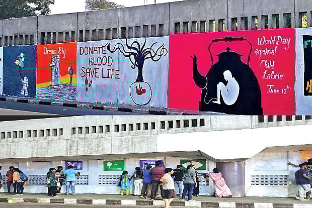 While one artist took charge to draw the outline of the art, several others painted the rest. Many in the group were budding artists looking for a chance to interact with like-minded people. By dawn, the volunteers had painted the walls with messages that spoke on peace, unity, women’s safety and nature. Some murals urged people to donate blood, and stand up against child labour, while a few others encouraged people to save water and plant trees. The paintings also highlighted the 17 Sustainable Development Goals (SDGs).