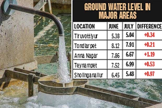 Among the 15 zones in the city, the water level in Anna Nagar has increased by 1.19 metres, which is the highest. In June, Anna Nagar’s groundwater level was at 7.86 metres and in July, the level reduced to 6.67 metres. The Metrowater has several observation wells (open wells) across the city to measure the groundwater levels every month. However, the groundwater table in Kodambakkam zone remained the same for two months as the level went down by a mere six millimetres. In July, Kodambakkam had groundwater level at 8.37 metres. From June 1 to August 10, the city has received 251 mm rainfall, which is 15 per cent higher than the average rainfall of 218 mm.