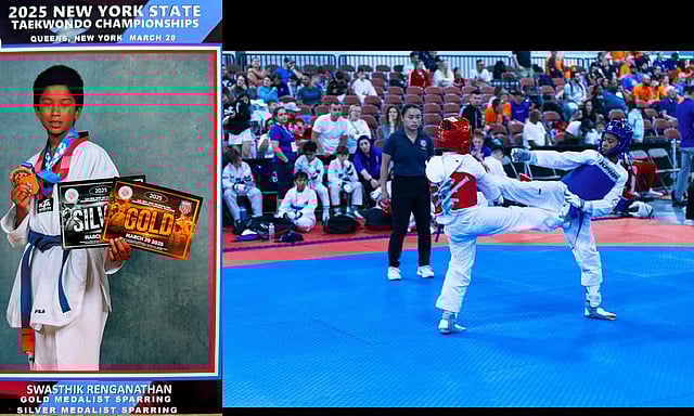 His Taekwondo journey began in 2019, when we were waiting for our order at a Chinese diner,” begins Renganathan Rengarajan, Swasthik’s father.