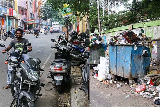 The biggest violation is the rampant parking of two-wheelers on both sides of the road. The two-wheelers that belong to patrons, owners, employees and residents occupy the footpath, forcing pedestrians to take to the road. The vehicles are even seen spilling over from the footpath on to the roads themselves.