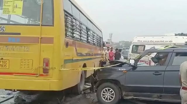 NEW DELHI: At least six people died in a collision between a school bus and a car on the Delhi Meerut Expressway on Monday morning, the police said. According to the police, the school bus was empty and was reportedly coming from the wrong direction.