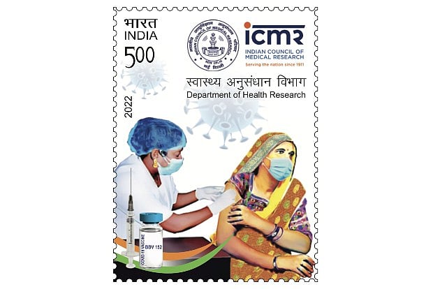 The commemorative stamp design features a healthcare worker inoculating a senior citizen with a Covid vaccine, along with an image of the "Covaxin" vial.