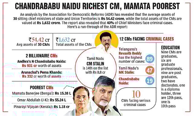 The ADR report highlights that 10 of the 12 CMs with criminal cases are booked under serious charges such as attempted murder, bribery, kidnapping, and criminal intimidation. The issue cuts across political parties, including the BJP, Congress, and regional outfits, suggesting it is systemic rather than confined to one state or party. The 10 CMs are: Revanth Reddy, MK Stalin, Chandrababu Naidu, Siddaramaiah (Karnataka), Hemant Soren (Jharkhand), Devendra Fadnavis (Maharashtra), Sukhvinder Singh Sukhu (Himachal Pradesh), Pinarayi Vijayan (Kerala), PS Tamang (Sikkim), and Bhagwant Mann (Punjab).