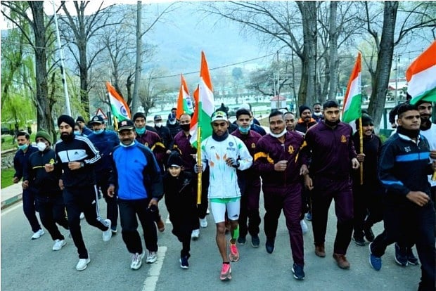 "To start this epic feat, Naik N.A. Velu P was flagged off from 92 Base Hospital at Srinagar on April 1 by a heartwarming gathering of enthusiasts who accompanied him in his solo run for the initial 5 Kms carrying the National Flag and boosting his morale. To cover this mammoth distance from Kashmir to Kanyakumari in 50 days Naik Velu P would be running 70-100 KMs per day crossing various States and major towns and cities.
