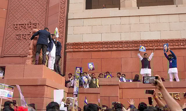 The protesting INDIA bloc MPs also came face to face with demonstrating BJP MPs in front of Makar Dwar of Parliament as the two sides engaged in loud sloganeering in a bid to outdo each other and a melee ensued as the MPs were moving towards the steps to go inside Parliament building.