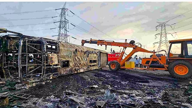 A senior transport department official said the reason behind the accident could be momentary loss of concentration on the part of the bus driver, due to which the bus directly hit a pole at a high speed before falling on its right side. The impact of hitting the pole was so severe that the front axle of the vehicle was broken, he said. Sources from the transport department said the bus rammed into a road divider on the highway after its one of its front tyre burst and fell on the diesel tank side. The leakage of fuel and sparks produced due to friction while the bus was getting dragged could have triggered the fire.