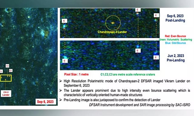 “Chandrayaan-3 lander is imaged by the Dual-frequency Synthetic Aperture Radar (DFSAR) instrument onboard the Chandrayaan-2 Orbiter on September 6, 2023,” ISRO said.