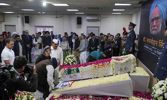 The mortal remains were kept inside the AICC headquarters for about an hour, with several top leaders of the Congress, including Mallikarjun Kharge, Sonia Gandhi and Rahul Gandhi, paying their last respects, among others.