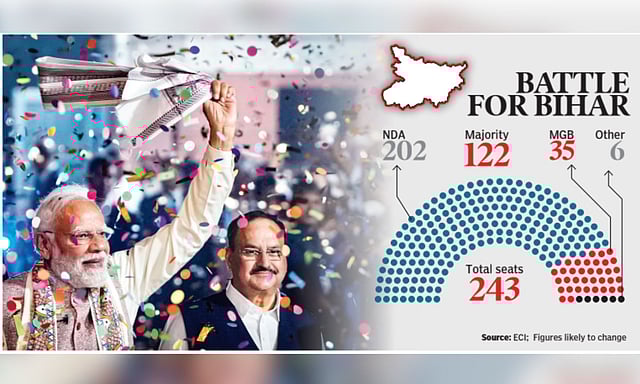 NEW DELHI: The ruling NDA decimated the Mahagathbandhan in Bihar on Friday to retain power, reaffirming Prime Minister Narendra Modi’s popularity and Chief Minister Nitish Kumar’s enduring appeal and dealing a body blow to the Congress and ally RJD.
