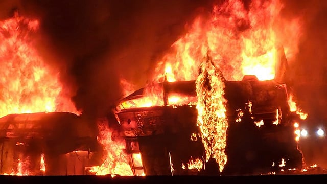 The accident was so severe that the bus and the truck were completely mangled. Fire spread all over the road as people struggled to douse the flame.