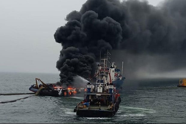 The Visakhapatnam Port Trust said in a release it deployed four of its crafts to douse the fire after a tug towed the burning vessel away from the SPM terminal to a safer place.