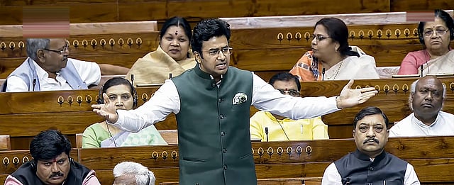 BJP MP Tejasvi Surya speaks in the Lok Sabha during the Special session of Parliament, in New Delhi, Thursday, April 16, 2026 PTI